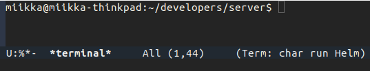 Lisäksi on hyvä huomata, että use-packagen alle on lisätty myös declare-function-määrittely. Kerromme näin Emacs-tavukääntäjälle, että käytämme koodissamme term.el-tiedostossa sijaitsevaa term-send-raw-string-funktiota. Tämän määrittelyn ansiosta Emacs ei anna varoitusta komennon käytöstä.