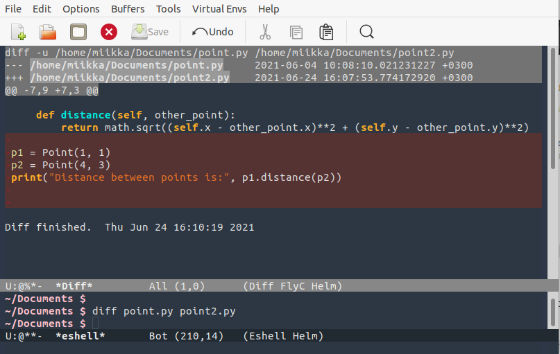 Monet Emacs-työkalut toimivat myös automaattisesti yhdessä Eshellin kanssa. Esimerkiksi tabulaattoritäydennys eshellissä osaa hyödyntää Helmiä täydentämiseen. Samoin diff-komennon ajaminen avaa Emacsin oman Diff-bufferin.