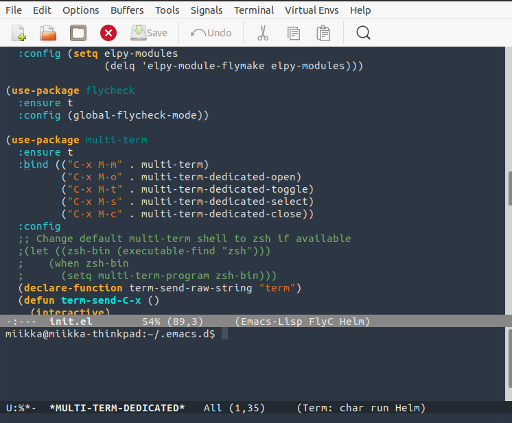 Oma valintani Emacs-terminaaliksi on jo pitkään ollut multi-term-paketti. Sen pystyy ottamaan käyttöön init.elin välityksellä seuraavasti: