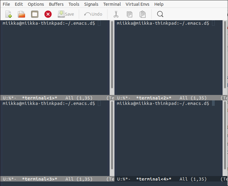 Multi-termillä voi avata Term-moodissa olevan bufferin komennolla M-x multi-term. Tätä samaa komentoa käytetään myös avaamaan lisää terminaali-ikkunoita. Lisätään tälle komennolle globaali pikanäppäinyhdistelmä: